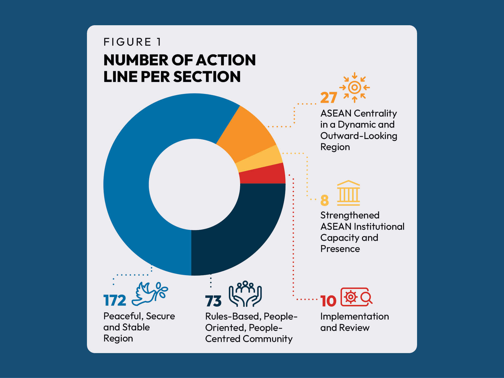 The APSC Blueprint 2025 is composed of five sections: (1) rules-based, people-oriented, people-centred community; (2) peaceful, secure and stable region; (3) ASEAN Centrality in a dynamic and outward-looking region; (4) strengthened ASEAN institutional capacity and presence; and (5) implementation and review. The 290 action lines of the Blueprint are distributed across these sections, as shown in the Figure 1. By year-end 2025, the implementation rate of the APSC Blueprint 2025 reached 99.6 per cent, with 289 of the action lines acted upon.