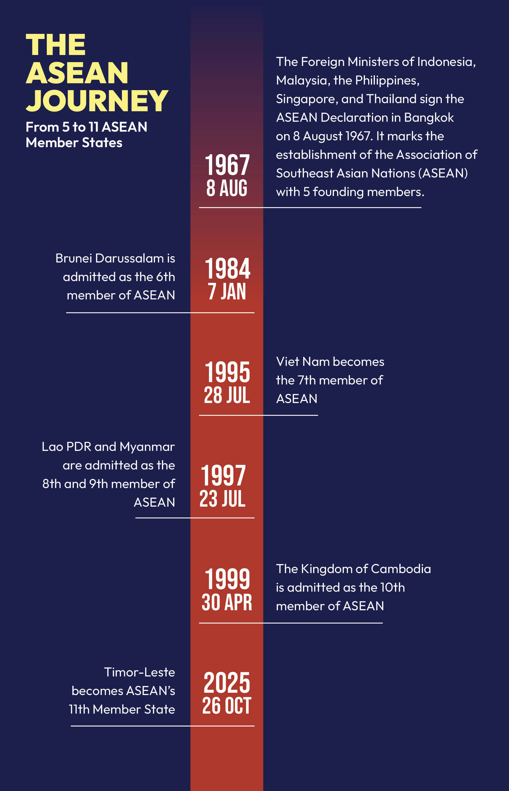 Timor-Leste offi cially applied for ASEAN membership in 2011. In 2022, ASEAN Leaders agreed in principle to admit Timor-Leste as a Member State, granting it Observer Status in ASEAN meetings. This was followed by the adoption of the Roadmap for Timor-Leste’s Full Membership in 2023, which guided its preparations to meet ASEAN’s membership criteria, including accession to ASEAN legal instruments and participation in meetings across all three ASEAN Community pillars. The ceremony represents the culmination of this dedicated journey and ASEAN’s collective support in welcoming Timor- Leste into the ASEAN family.