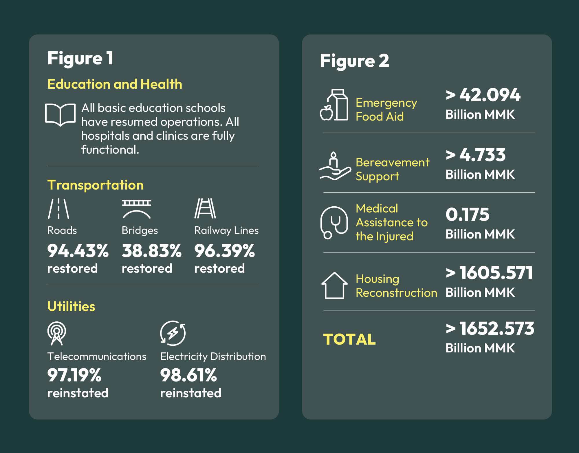 An additional 340 billion Myanmar kyat (approximately 161.90 million US dollars) has been utilised for early recovery initiatives. Furthermore, food and essential commodities donated domestically and internationally were distributed promptly to affected areas.